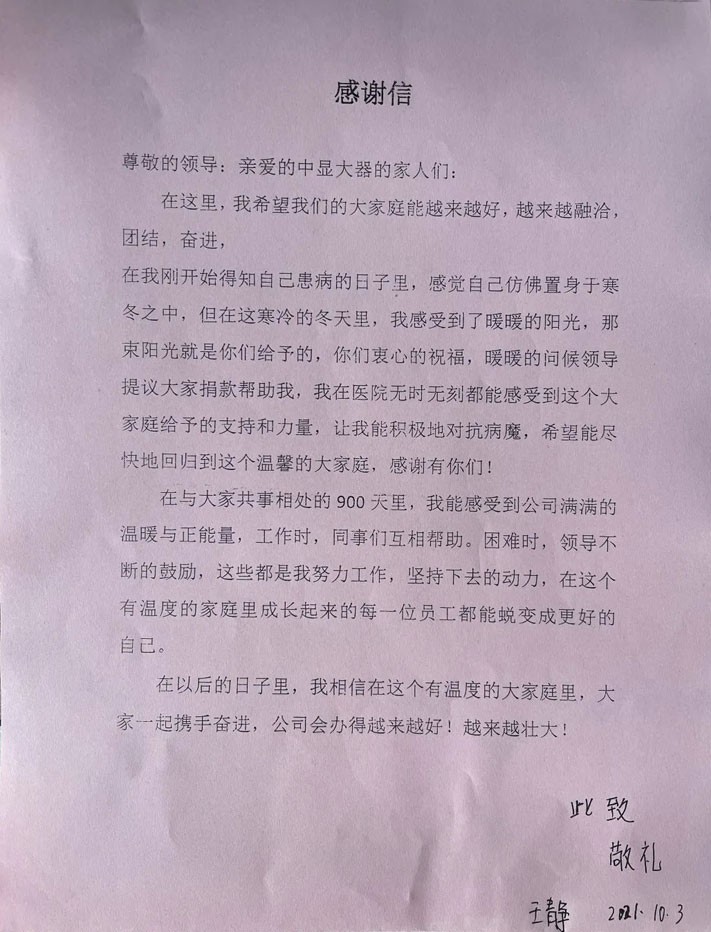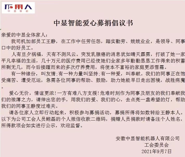 今年8月,我公司員工王靜不幸被醫院查出了乳腺癌,這對于一個普通工薪家庭來說是沉重的打擊。公司人事部得知消息后,第一時間向公司負責人匯報王靜的病情,并在公司微信工作群里面發起愛心捐款倡議。病魔無情,人間有愛!中顯領導和員工們紛紛慷慨解囊,在短短兩天時間內,共計為王靜籌得愛心捐款2萬元。